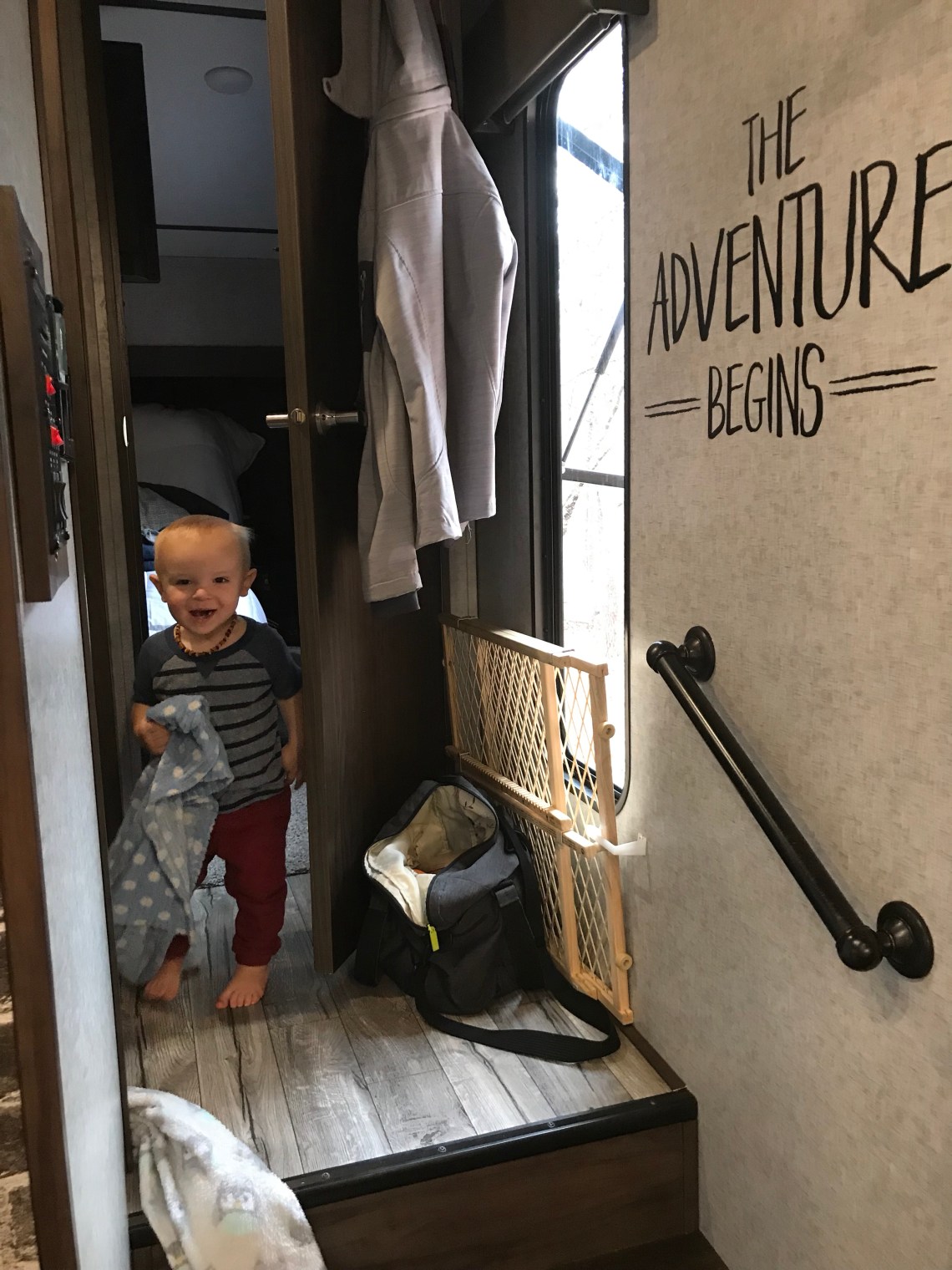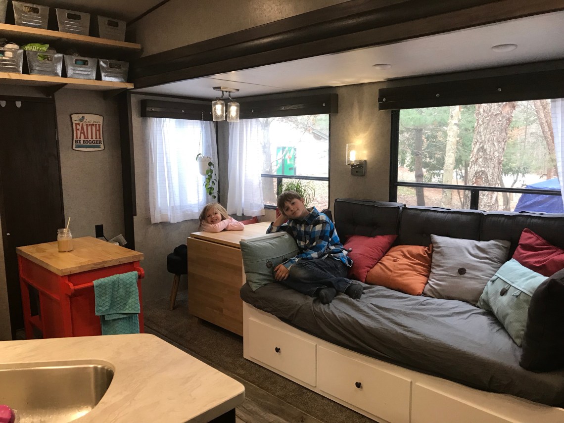 As the crazy idea evolved, we began our research. RV shopping became a bit of a pastime for us and the kids. We all enjoyed imagining our crazy new life in each camper we considered. We went back and forth for so long, I think the kids were more relieved than we were when we finally settled on the Arctic Wolf 315 bunkhouse. It needed a few adjustments in order to accommodate our family, but style wise it felt like home and it met the “under 35 foot” requirements we have read are common at state and national parks. The bunkroom had two top bunks, which Asia and Jake quickly claimed, as well as a futon type sofa with three drawers built underneath. We pulled out the sofa and the drawer unit, reassembled two of the drawers, one on top of the other, and built a middle bunk for River leaving just enough room for a baby bunk for Micah. In the main living area, we pulled out the four person dinette and the sofa bed, which only offered seating for two. We found an awesome fold-away table at IKEA and a twin size day bed sporting a second twin roll-out as well as three huge storage drawers. We added a rolling island to the kitchen and as much storage solutions as possible to the second bathroom turned laundry room. We built shelves and added bins to every possible spot you can imagine. We were ready to move in! Or so we thought. 😉