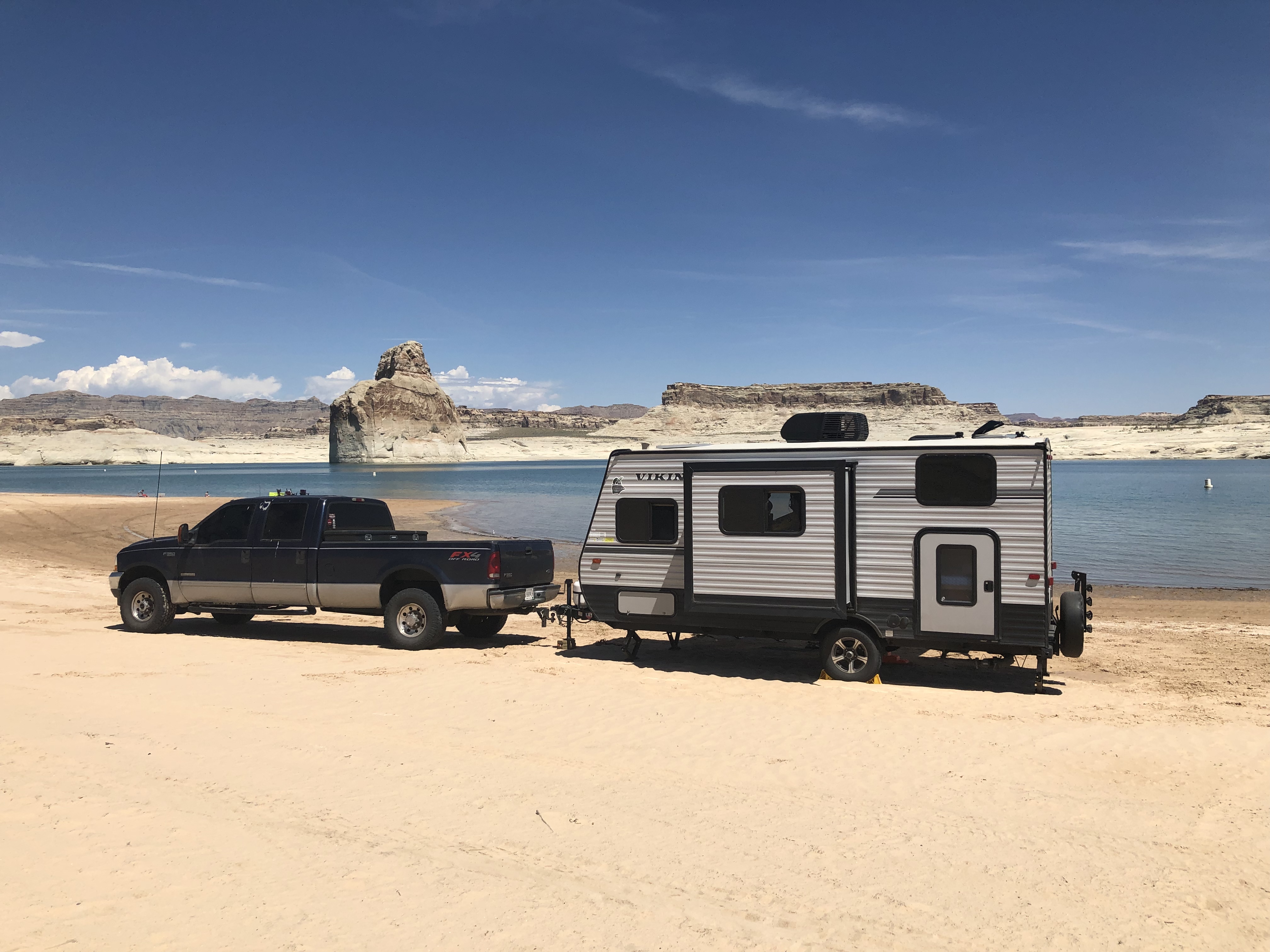 Anyways, we headed to the lake to set up camp. The campground was open dispersed, which meant you could park anywhere, but in this case, everywhere was sand. Deep sand. There were campers scattered about, so we figured if they could do it, we could do it. We chose a spot and set up. The water was cold, but the kids were brave, and we just chilled out the rest of the day. That evening a windstorm picked up and you couldn’t even hardly breathe outside. The wind lasted through the night and into the morning, so we decided to pack it up. We were nervous about our exit strategy through the deep sand. Erich saw our neighbor pulling a fifth-wheeler packing up. His rig was much bigger than ours so he asked what his strategy was. His reply: “Get a running start, try to hit 40mph before I hit the deep sand, and then just keep going.” We waited and watched. What a sight to see! Lol. That guy stomped on the gas and I swear, he never let up. We were both sure he was gonna flip, his rig was all over the place. It was both reassuring and distressing. We were smaller and had already let some air out of our truck’s tires, but still, we were pretty sure we were going to be stuck in the sand and at the mercy of another camper pulling us out. We hooked up, aimed for the same path as the fifth-wheeler, and gunned it. We were almost clear when we started slowing down, spinning out and fishtailing. We thought we were done, but Erich kept his foot on the gas and our tires reached some slightly more solid land just in time. It was pretty fun. The rest of the drive was much less sketchy and I’m happy to say, we made it out in one piece and right side up.