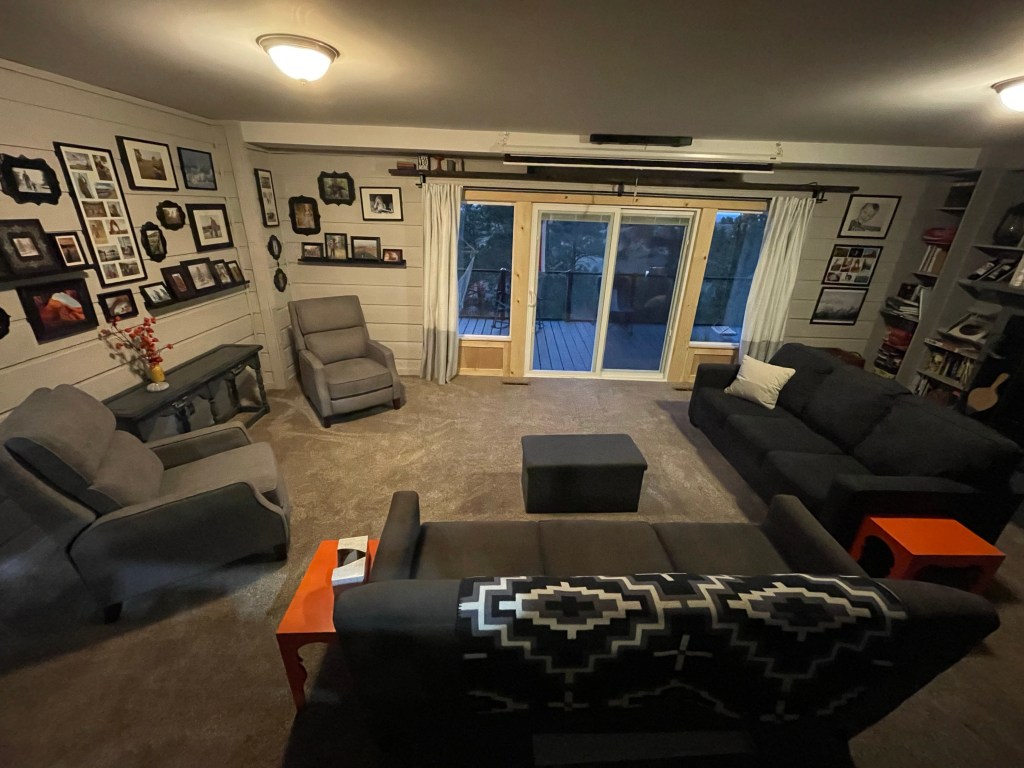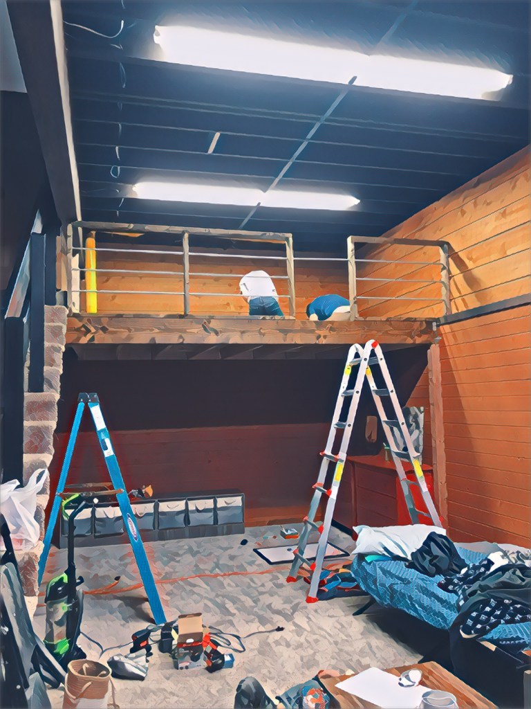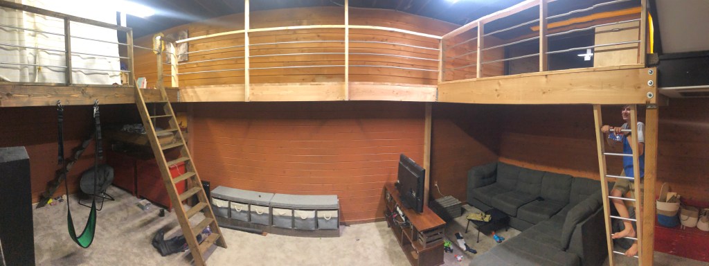 After the kitchen, we focused on the kids’ space. We had a nice big game room with high ceilings and two smaller bedrooms in the basement. We didn’t want to lose the game room space, so we built River and Micah each a loft (with a bridge in between) for their own personal space. It’s been almost a year and River is already bumping her head, so it might not be a permanent solution, but it sure has been a fun one. We haven’t gotten around the painting the basement, so the colors you see are not ours.
