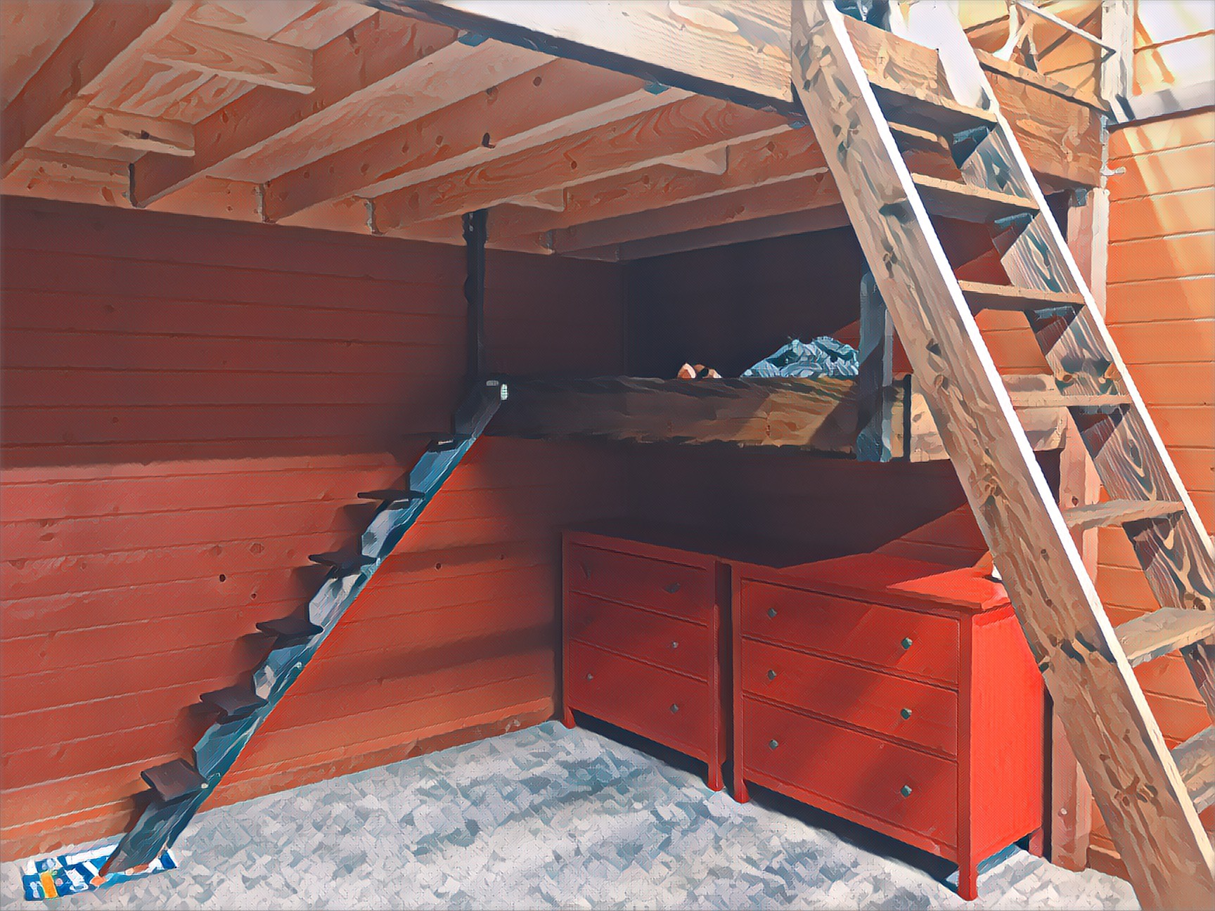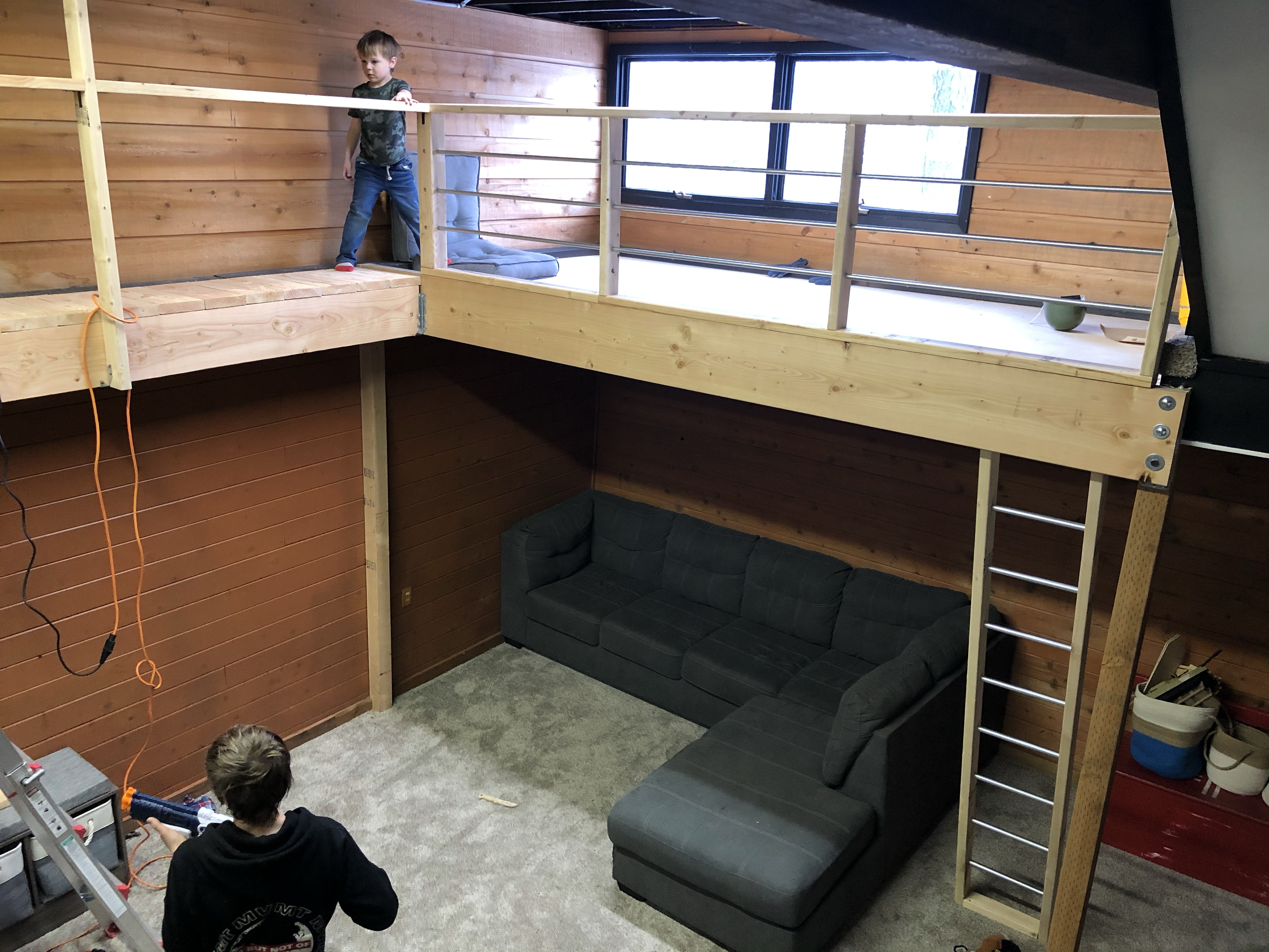After the kitchen, we focused on the kids’ space. We had a nice big game room with high ceilings and two smaller bedrooms in the basement. We didn’t want to lose the game room space, so we built River and Micah each a loft (with a bridge in between) for their own personal space. It’s been almost a year and River is already bumping her head, so it might not be a permanent solution, but it sure has been a fun one. We haven’t gotten around the painting the basement, so the colors you see are not ours.